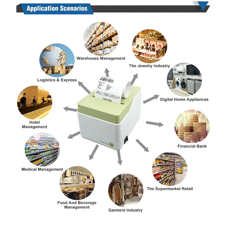 దీని ముద్రణ వేగం 250 mm/s, ప్రభావవంతమైన ముద్రణ వెడల్పు 72 mm లేదా 64 mm. ఇది UPC-A, EAN-13, CODE39 మరియు CODE128తో సహా బహుళ బార్‌కోడ్‌లకు మద్దతు ఇస్తుంది, ఇది క్యాటరింగ్, డిపార్ట్‌మెంట్ స్టోర్‌లు మరియు సూపర్ మార్కెట్‌ల వంటి వివిధ పరిశ్రమలకు అనుకూలంగా ఉంటుంది.