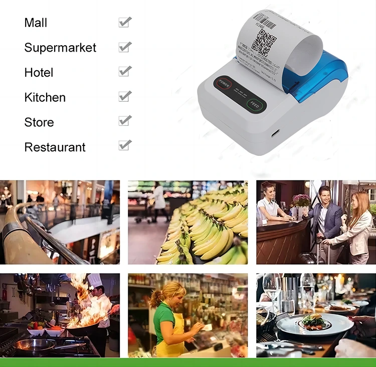 థర్మల్ బ్లూటూత్ వైర్‌లెస్ ఇంక్‌లెస్ ప్రింటర్లు బాగా ప్రాచుర్యం పొందుతున్నాయి మరియు రిటైల్, క్యాటరింగ్, లాజిస్టిక్స్ మరియు హెల్త్‌కేర్ వంటి బహుళ పరిశ్రమలలో విస్తృతంగా ఉపయోగించబడుతున్నాయి. షాపింగ్ రసీదులను త్వరగా ప్రింట్ చేయడానికి రిటైల్ పరిశ్రమ దీన్ని ఉపయోగించవచ్చు. క్యాటరింగ్ పరిశ్రమలో, ఇది తక్షణమే ఆర్డర్‌లను ముద్రించగలదు. లాజిస్టిక్స్ పరిశ్రమలో, ఇది ఎక్స్‌ప్రెస్ డెలివరీ లేబుల్‌లను ముద్రించగలదు. వైద్య పరిశ్రమలో, ఇది వైద్య రికార్డులు మరియు ప్రిస్క్రిప్షన్లను ముద్రించగలదు. ఈ అప్లికేషన్ దృశ్యాలు అన్నీ థర్మల్ బ్లూటూత్ ప్రింటర్ల యొక్క అధిక సామర్థ్యం మరియు ఆచరణాత్మకతను ప్రదర్శిస్తాయి.